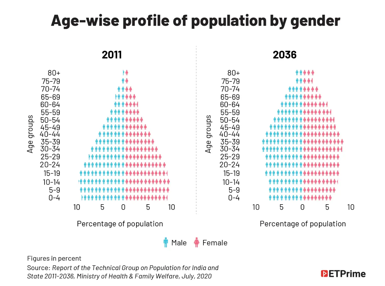 Examine the graphic below based on Indian government census in 2011. We can extrapolate the same forward. What do you see for 2036? India has the highest population segment in the 35-39 age bracket. This simply means the cohort will be between 45 and 50 years by 2046. Well within the peak spending age.