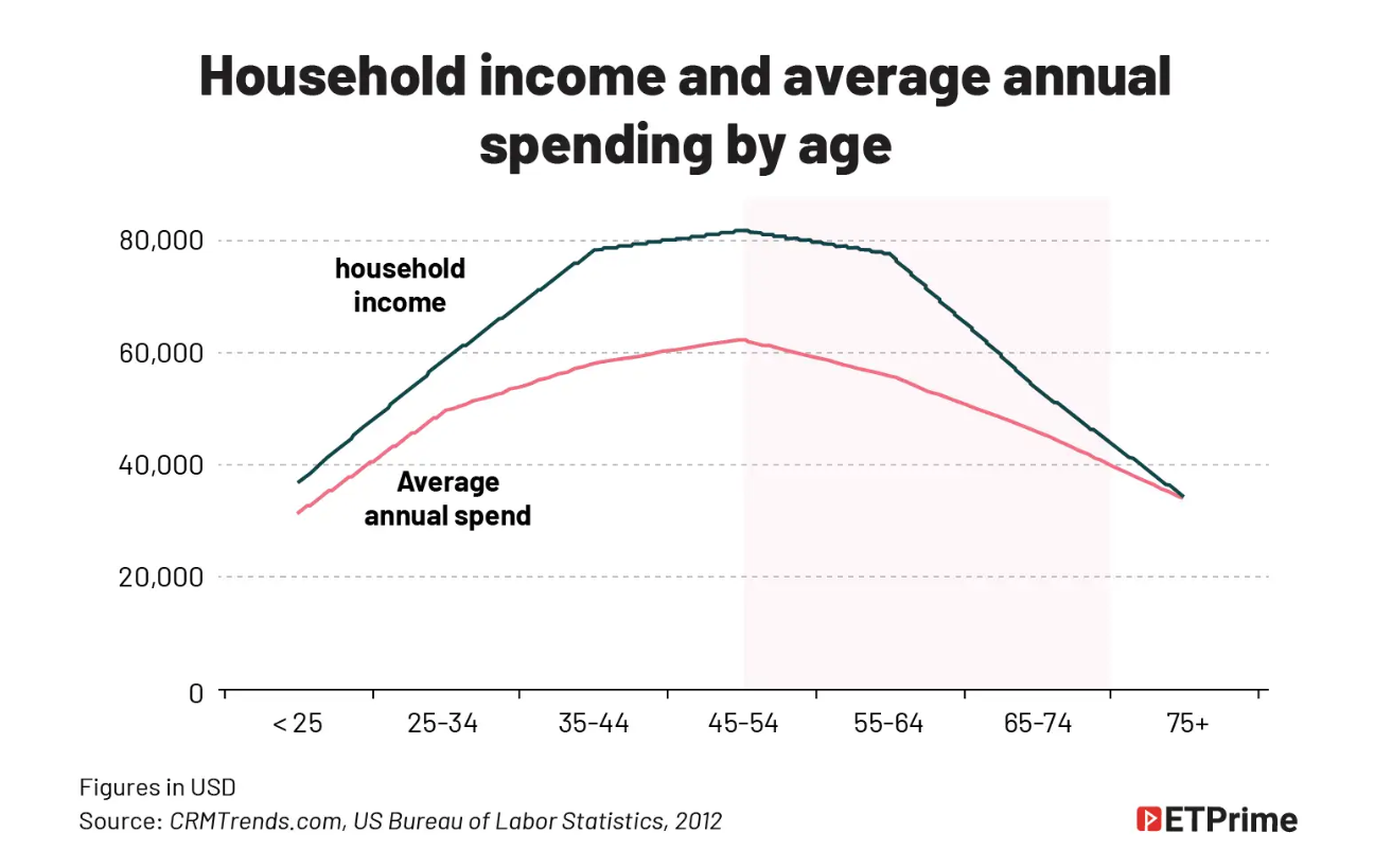 The experience is similar across the other developed nations as well. While the US spending peaks in the 45-54 age group, Japanese spending peaks at age 55 and UK’s at 50. After the age of 75, the US spending falls 46% from its peak and UK’s declines by 53%.