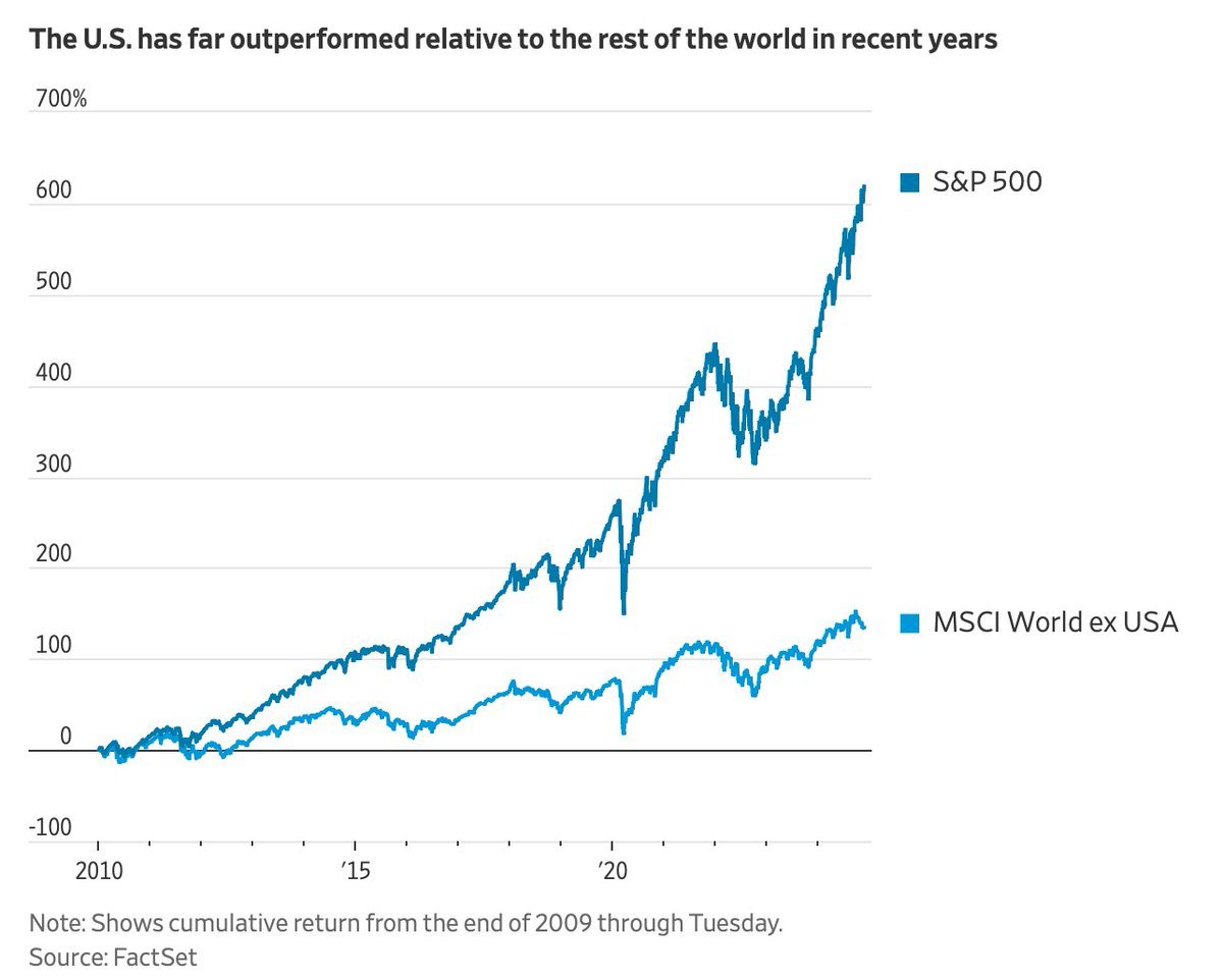 10. Dominance of US in MSCI World post 20010: The below chart best captures the US dominance vs rest of the world. #MSCI World Index had a weightage of 58% for International markets in 2010. The Weightage has been steadily coming down & is now at 33% only. The gradual decline in international allocation is due to EU economy stagnating & US regaining on tech strength. Finally China doing a self-goal & not proving to be an investor friendly markets as many thought. May be that was by design as they like capitalism of jobs creation but not financial engineering where a very few make money. Also many believe that 30% to 40% of US earnings come from international markets & stocks like Google, Meta, MSFT, AAPL, Amazon, Even McD, Starbucks & NIKE are in a way an exposure to global economies. US funds don’t need international exposure anymore. Meanwhile, #Argentina ETF (ARGT) has grown 45% YTD & 100% since #JavierMilei took power. Nothing is permanent. Valuation matters, always.